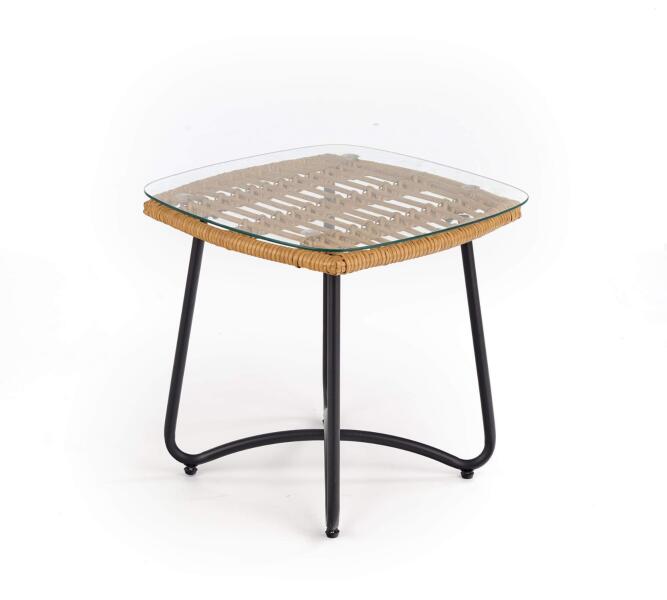 Modern kialakítású dohányzóasztal. Az asztallap szintetikus rattanból és üvegből, míg a láb porszórt acélból készült.